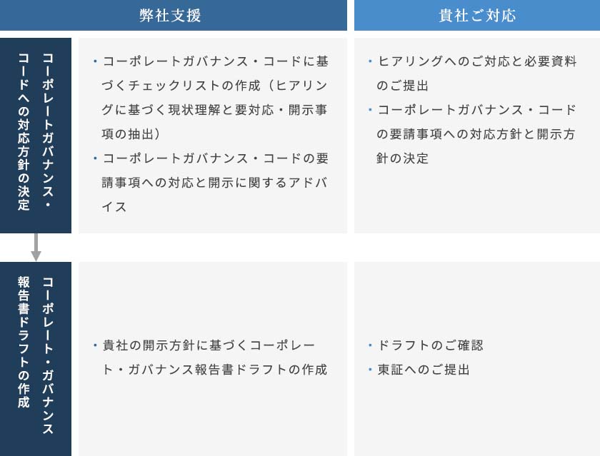 貴社においては、整備状況把握、課題抽出段階での基礎資料のご準備やヒアリングへのご対応、コーポレート・ガバナンスの整備方針のご決定、響きパートナーズが作成した「コーポレート・ガバナンスに関する報告書」ドラフトの確認を行っていただきます。